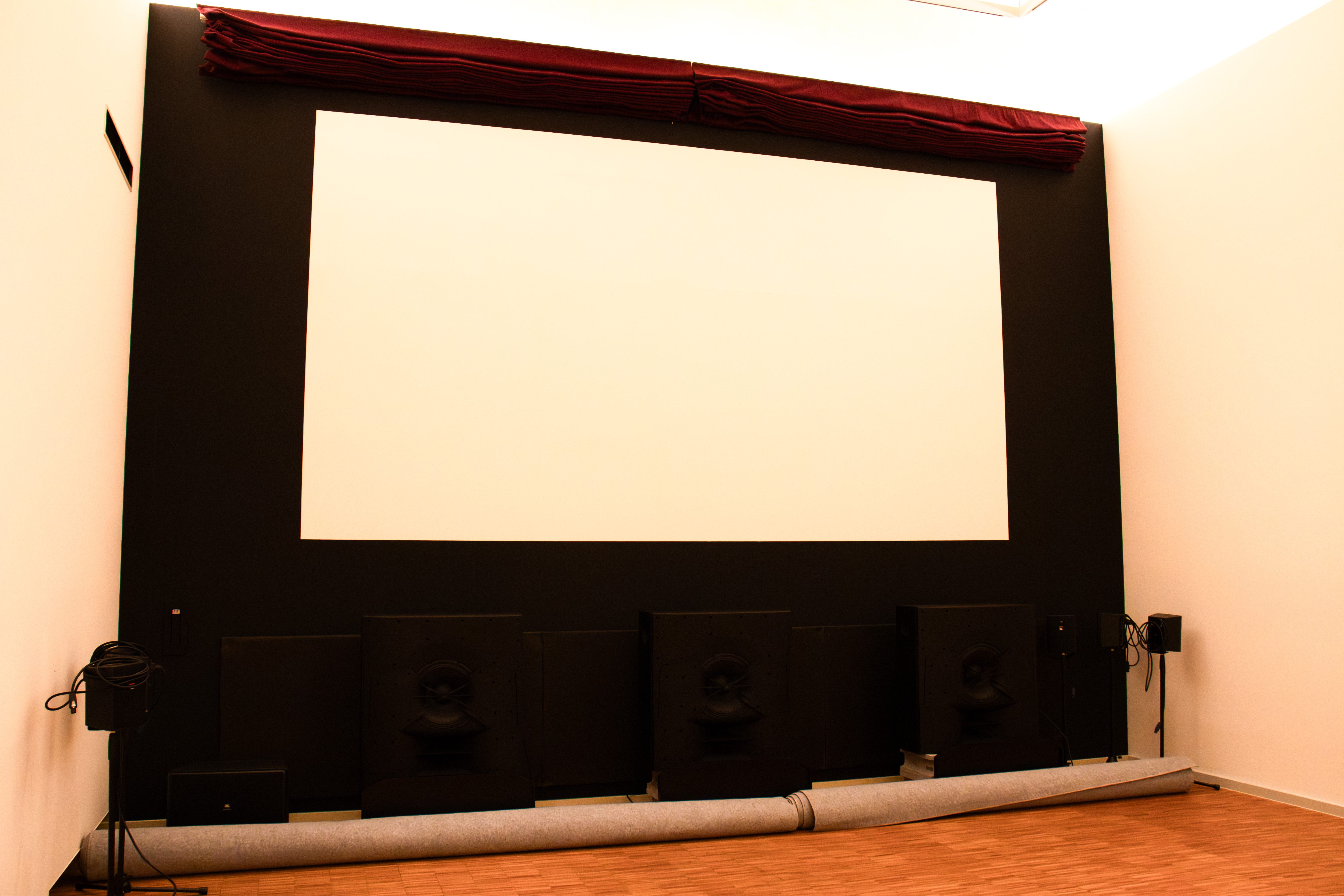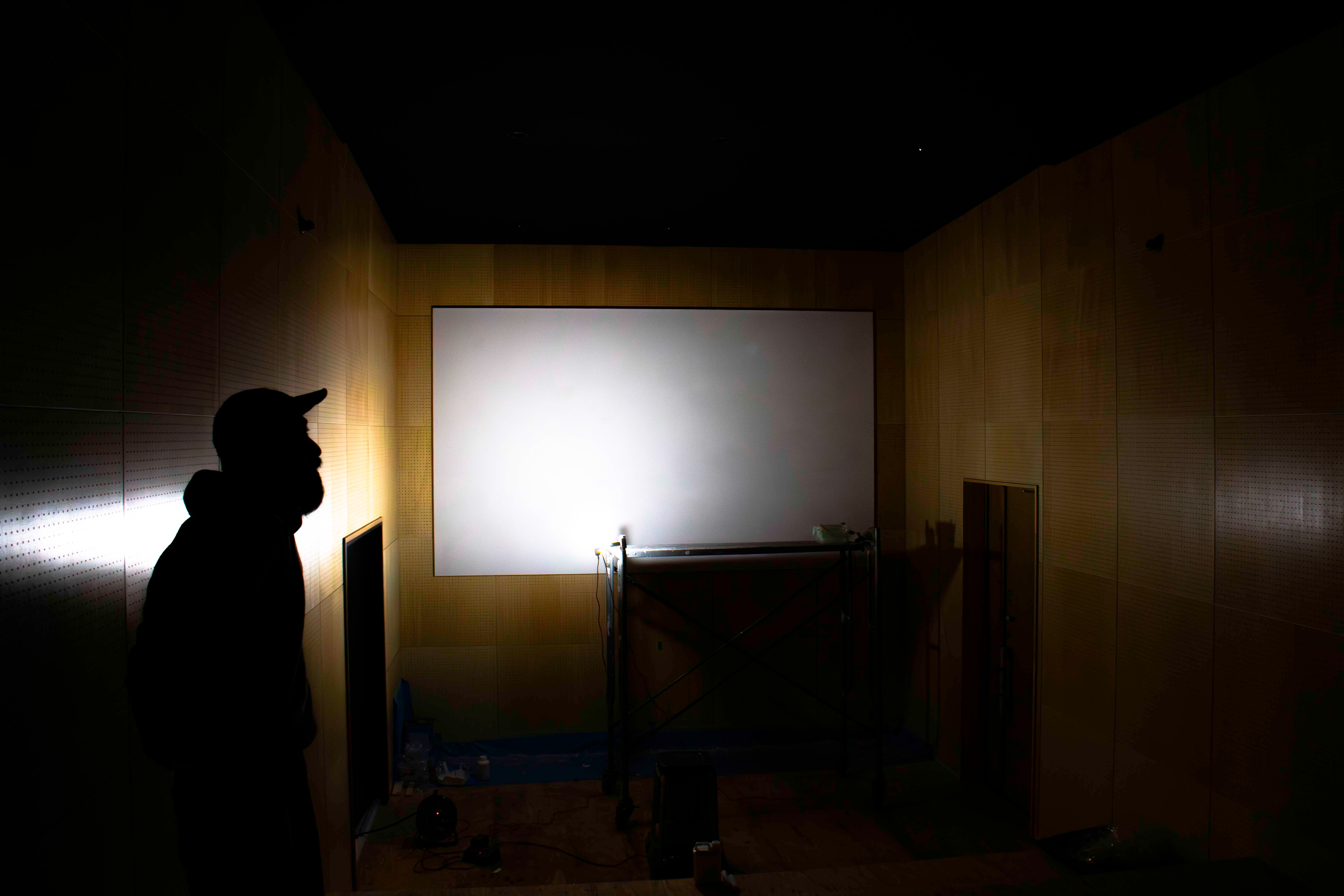 センタースピーカーと投映する壁。黒い壁も塗装
