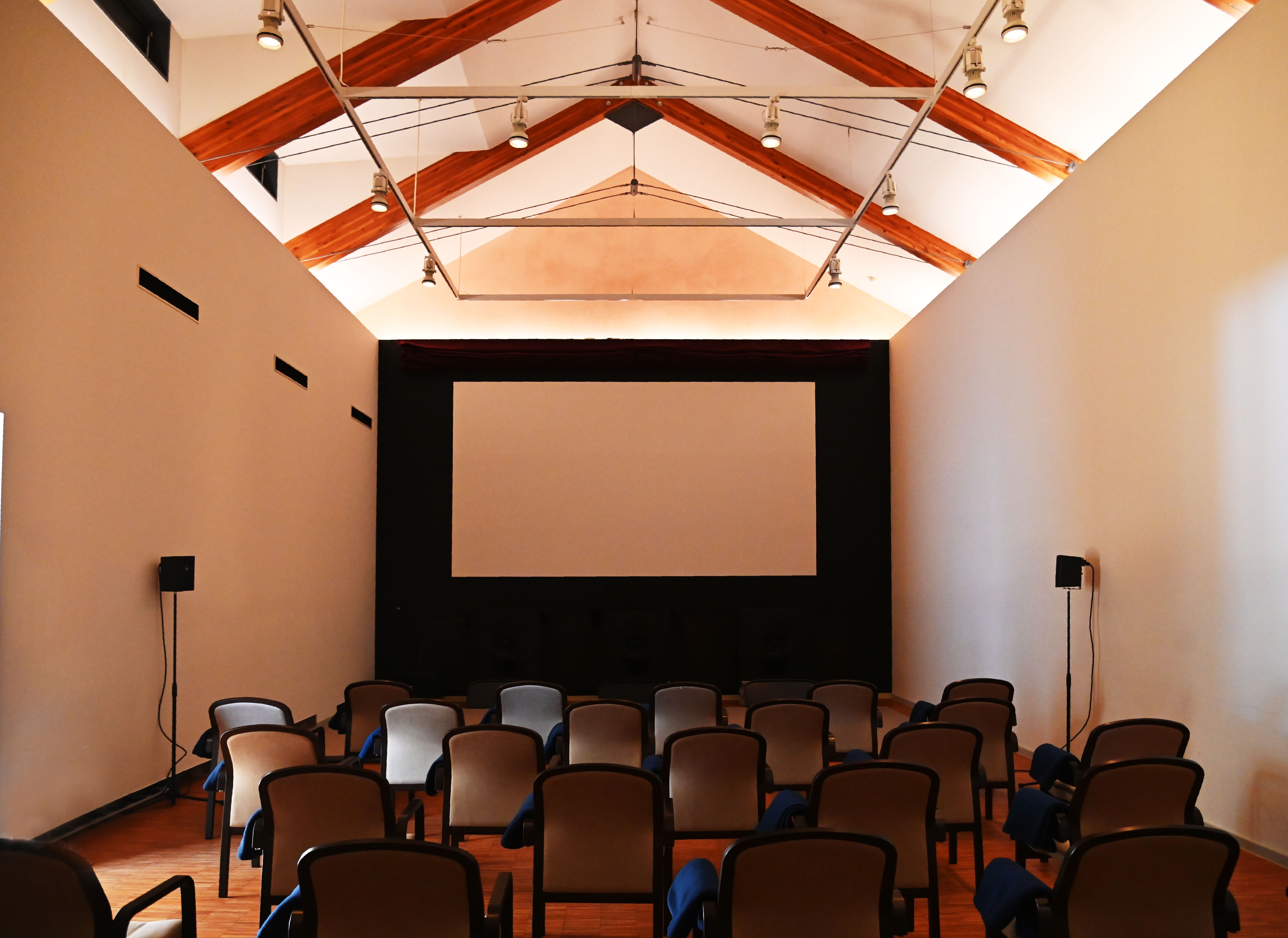 館内は1スクリーンで座席数は20席、寒冷地ならではの工夫として、エアコンの音を排除した空気循環システムや床暖房を導入。プロジェクターは身の丈に合った運営を重視して高額なDCP(※1)ではなく、あえてBlu-ray上映を選択。これは機材の10年ごとの更新に伴う多額の再投資リスクを回避し、経営を継続させるための決断だ。スクリーンは塗布型のペイントタイプで「OttO(オット)」(さいたま市大宮区)に続き、国内2例目だ。音響にこだわり、スピーカーの質や館内の壁の設計などを工夫する。また、旭川家具の産地かつ「家具の町」である東川町の特性を活かし、地元の職人制作の椅子を設置。ミニシアターとしては一人ひとりの座席スペースを広く確保し、ゆったりと映画を楽しめる鑑賞環境を整えている。